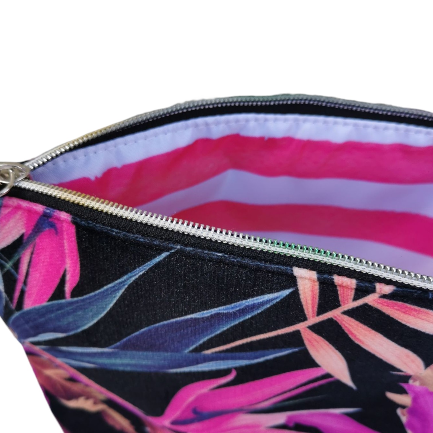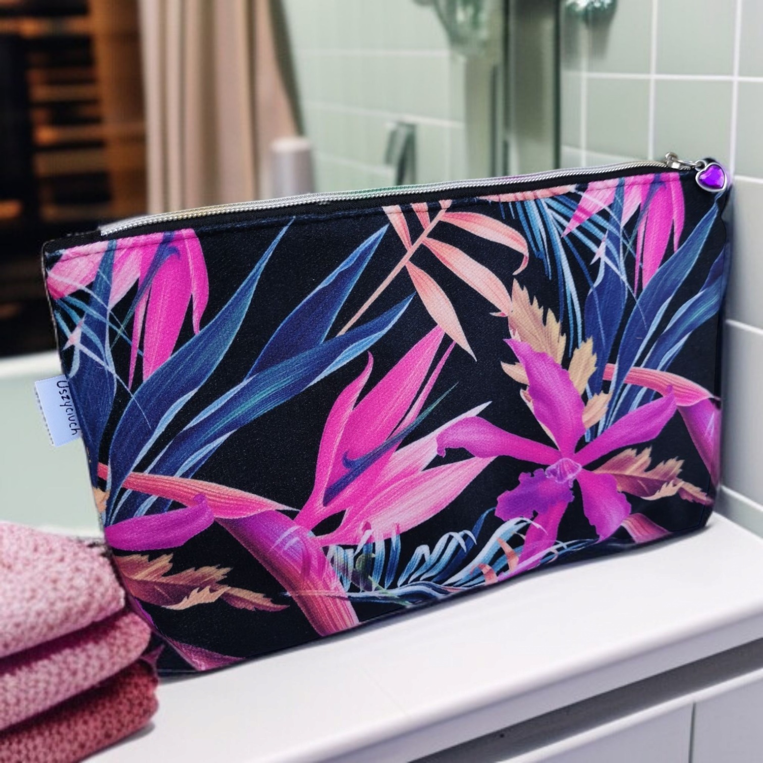 Kosmetyczka uszyta z wysokiej jakości weluru tapicerskiego z kolorowym wzorem.