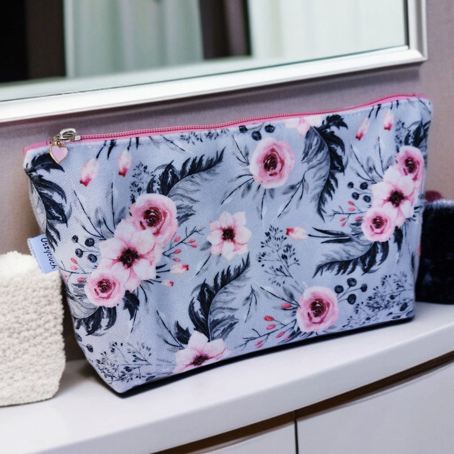 Kosmetyczka uszyta z wysokiej jakości weluru tapicerskiego z kolorowym wzorem.