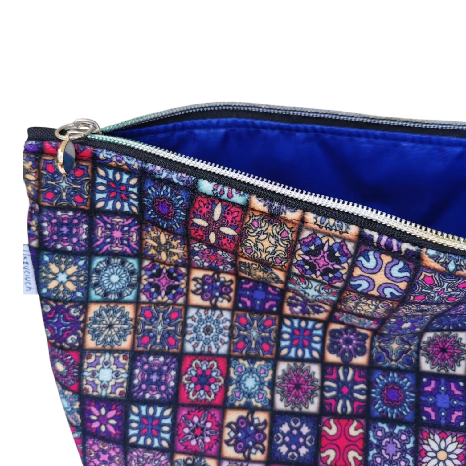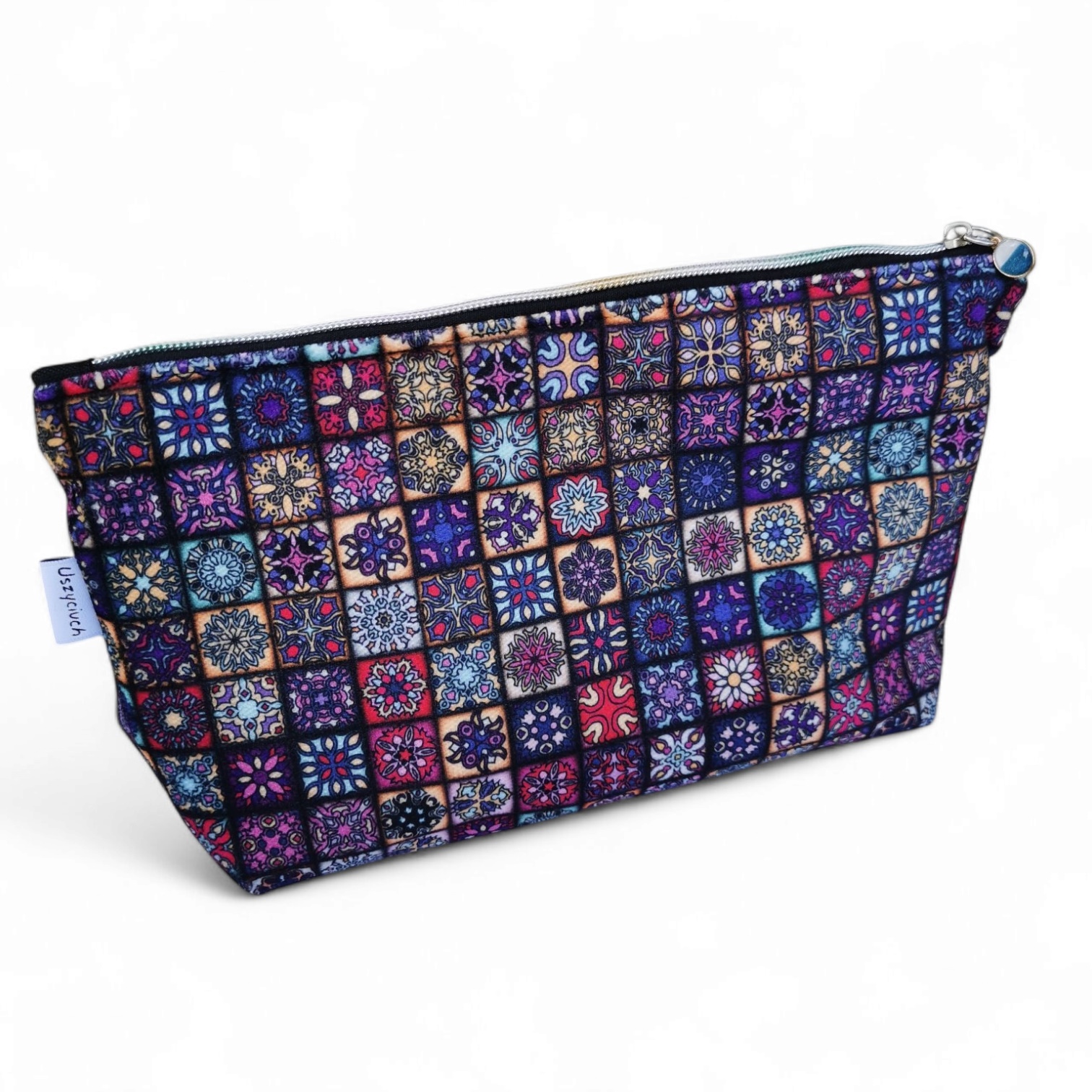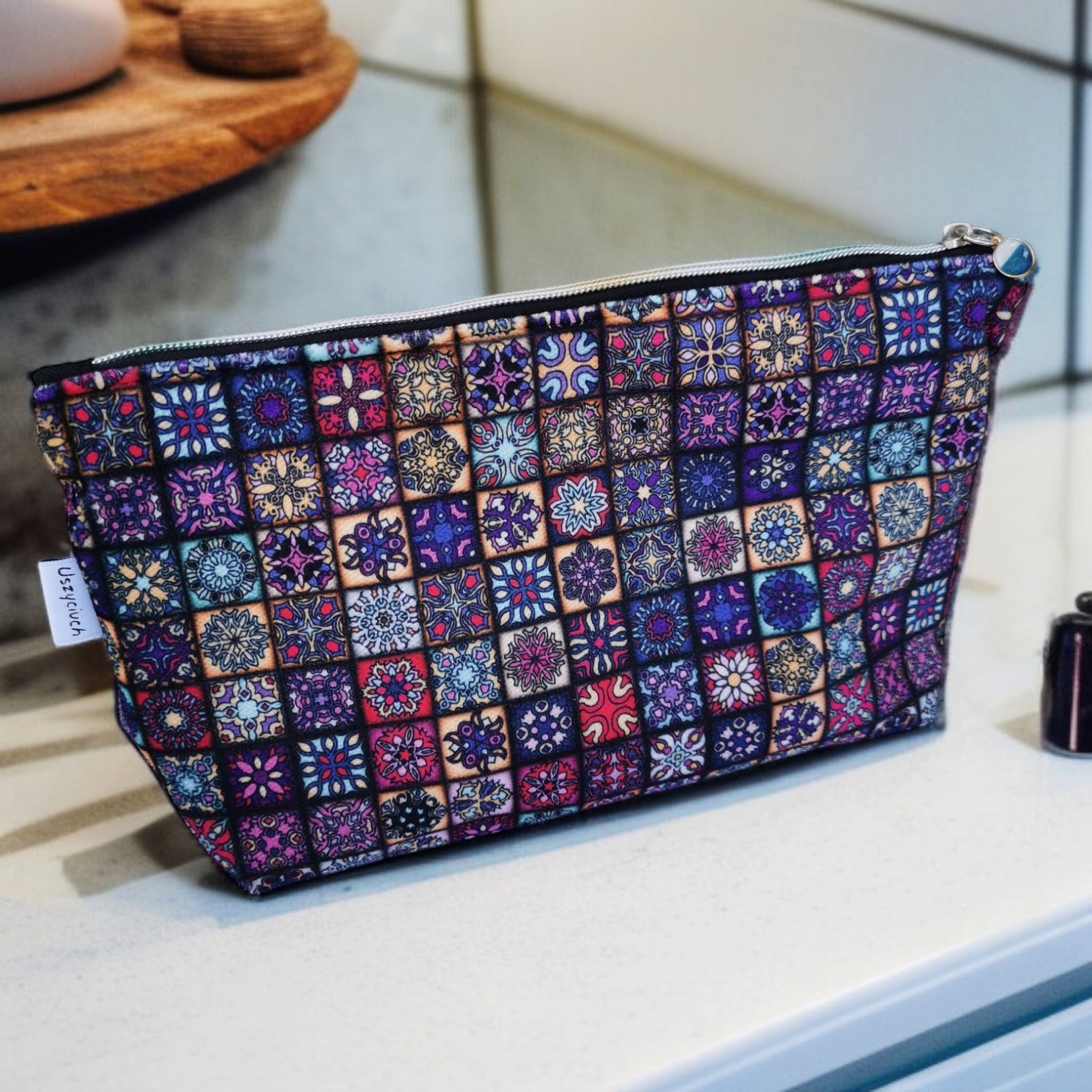 Kosmetyczka uszyta z wysokiej jakości weluru tapicerskiego z kolorowym wzorem.