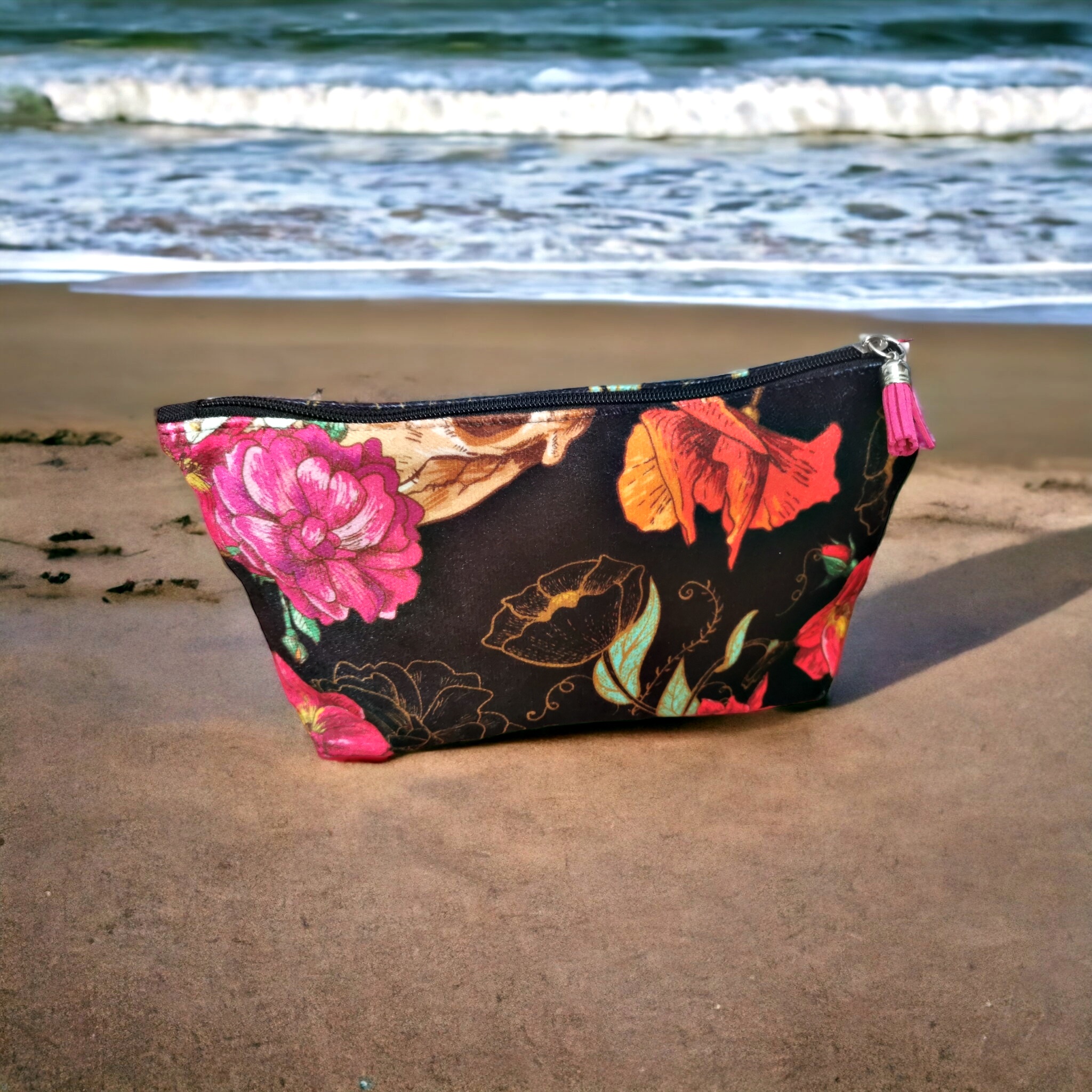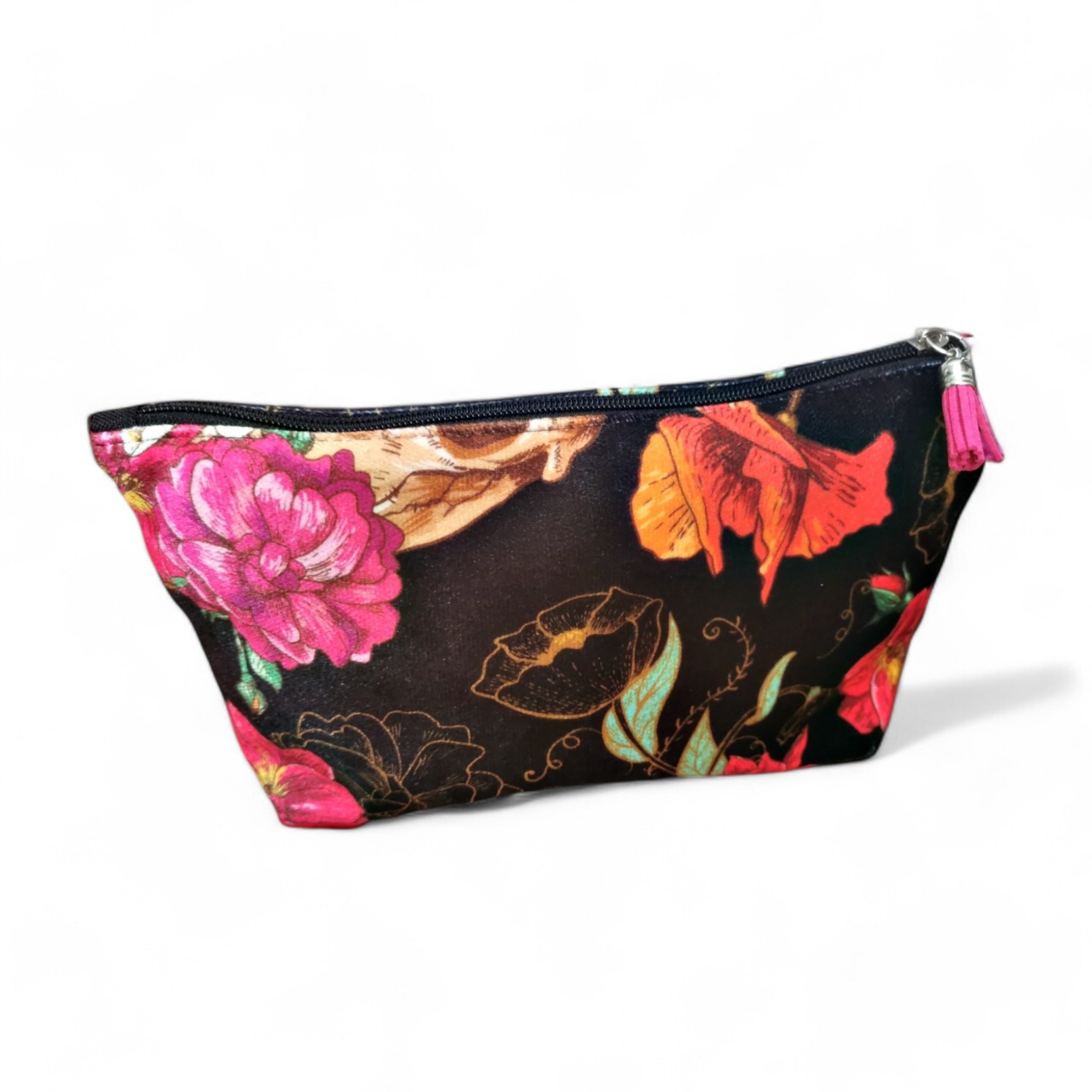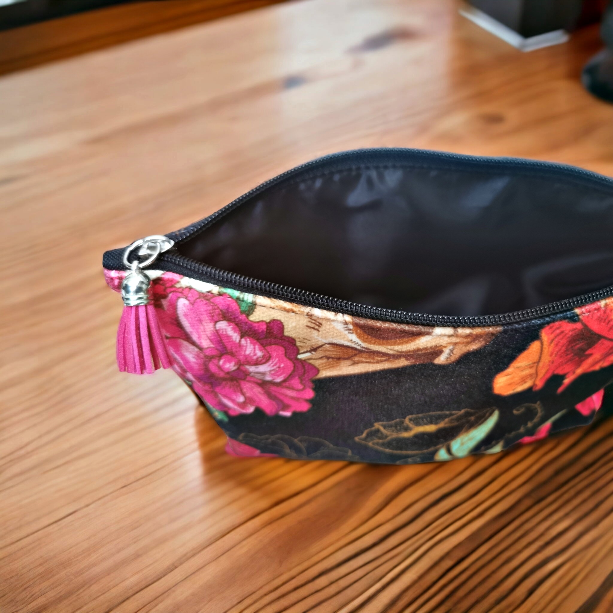 Kosmetyczka uszyta z wysokiej jakości weluru tapicerskiego z kolorowym wzorem.