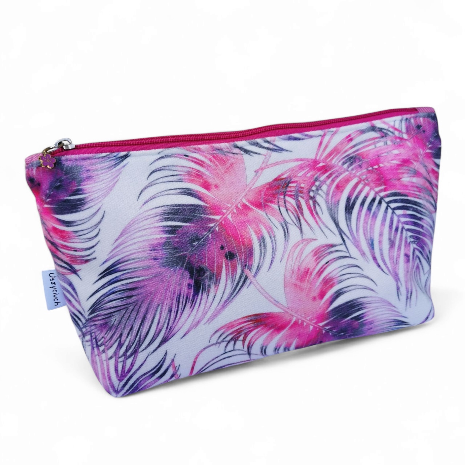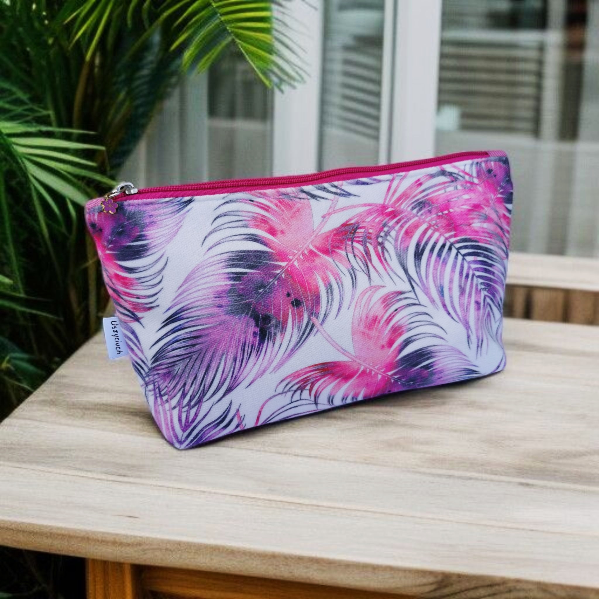 Kosmetyczka uszyta z wysokiej jakości weluru tapicerskiego z kolorowym wzorem.