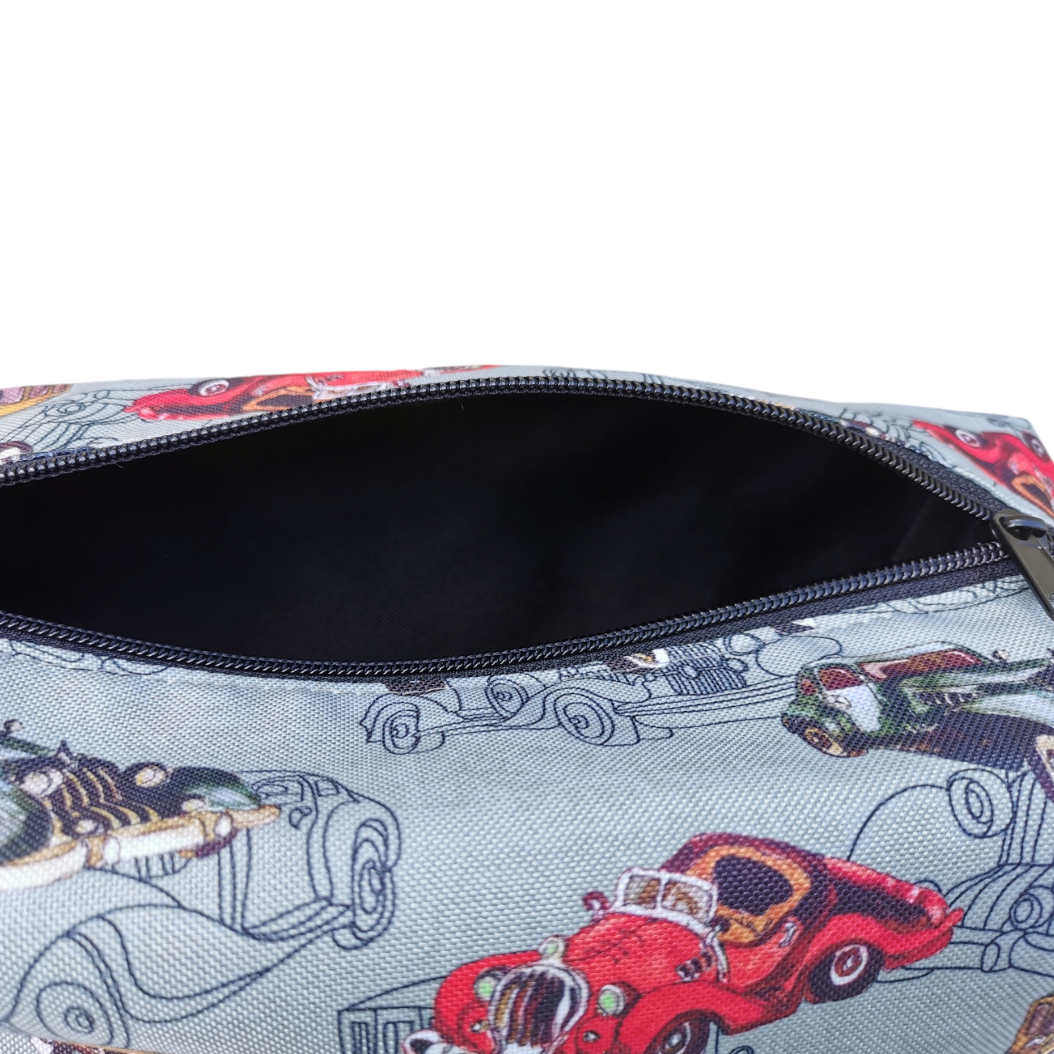 Kosmetyczka uszyta z wodoodpornej tkaniny i wodoodpornej podszewki w kolorze czarnym.
