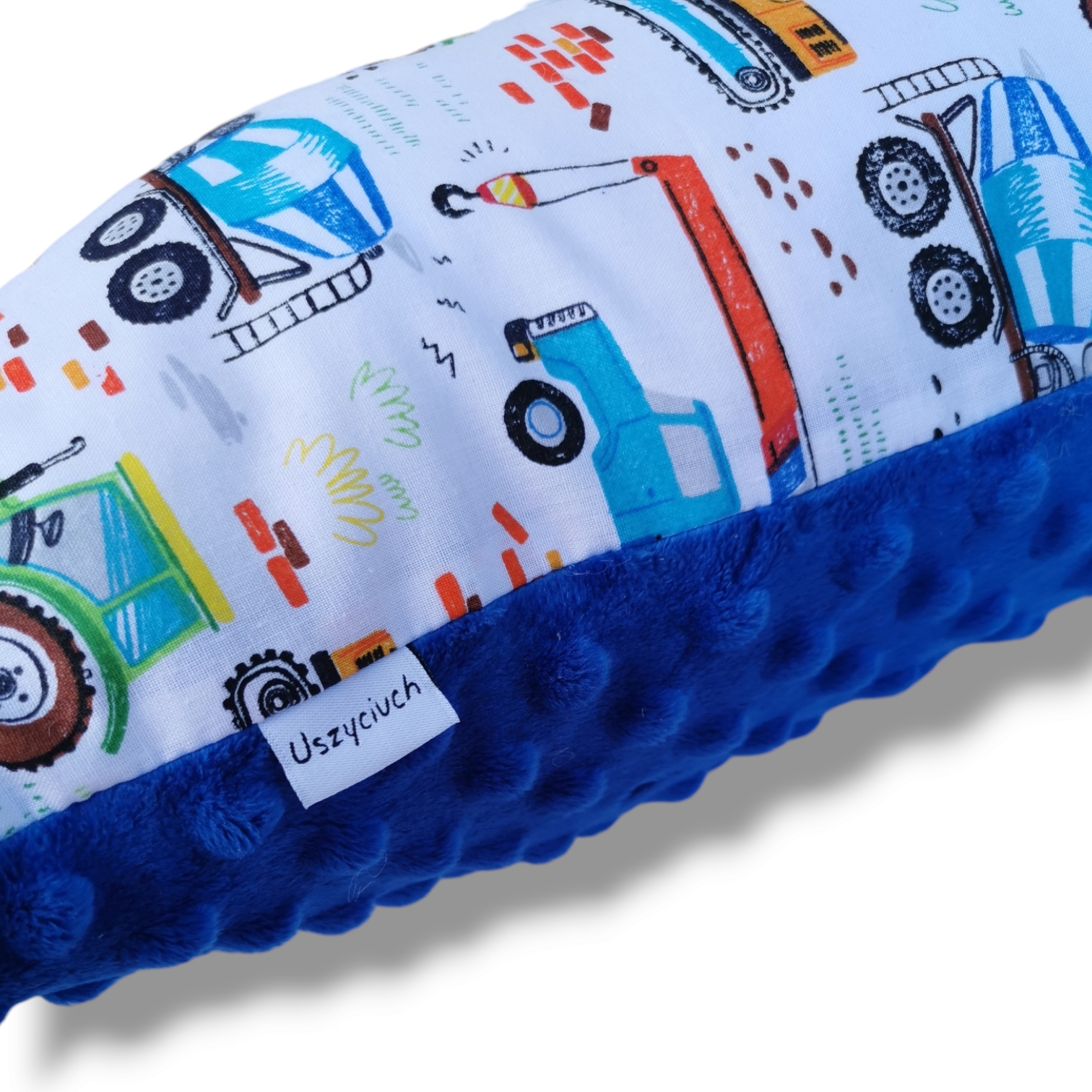 Stylowa ozdobna poduszka uszyta z bawełny 100% z wzorem w koparki i z mięciutkiego polaru minky.