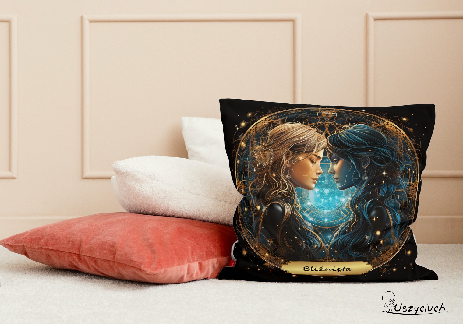 Stylowa ozdobna poduszka znak zodiaku uszyta z mikrofazy z nadrukowanym wzorem i z mięciutkiego gładkiego polaru minky w kolorze czarnym.
