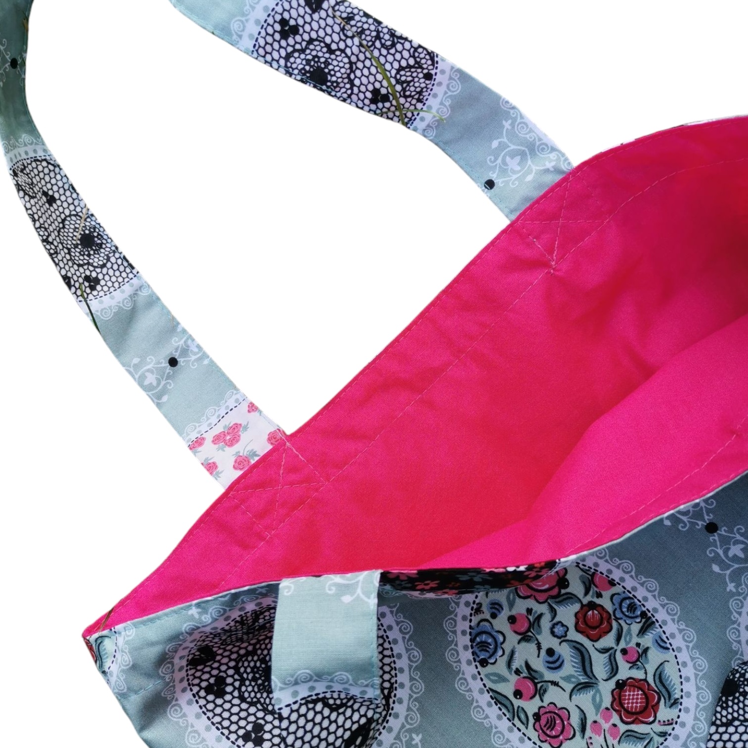 Ekologiczna torba na zakupy uszyta z bawełny 100% z nadrukiem i bawełnianą różową podszewką.