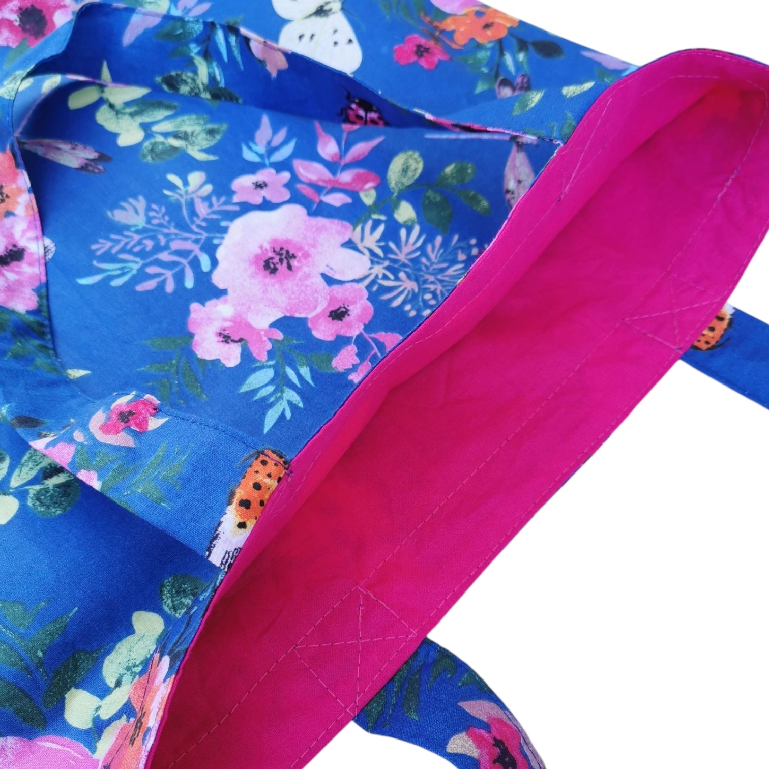 Ekologiczna torba na zakupy uszyta z bawełny 100% z nadrukiem i bawełnianą różową podszewką.